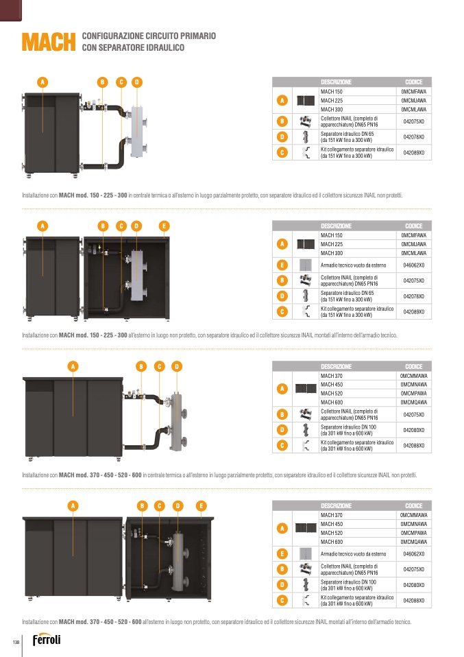 Installazione con MACH mod. 370 - 450 - 520 - 600 all’esterno in luogo non protetto, con separatore idraulico ed il collettore sicurezze INAIL montati all’interno dell’armadio tecnico.