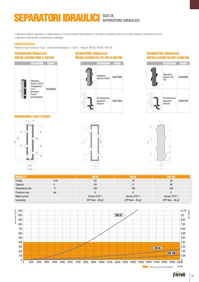 Pressione max di esercizio: 6 bar - Campo di temperatura: 0 - 100°C - Attacchi: DN 32 / DN 65 / DN 100