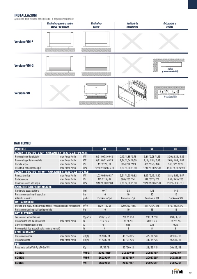 ACQUA (IN-OUT)°C: 45-40° - ARIA AMBIENTE: 20°C D.B 15°C W.B.