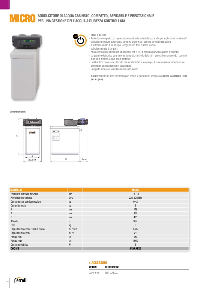 - Addolcitore ad alta affidabilità ed efficienza con 4 litri di resina ad elevata capacità di scambio