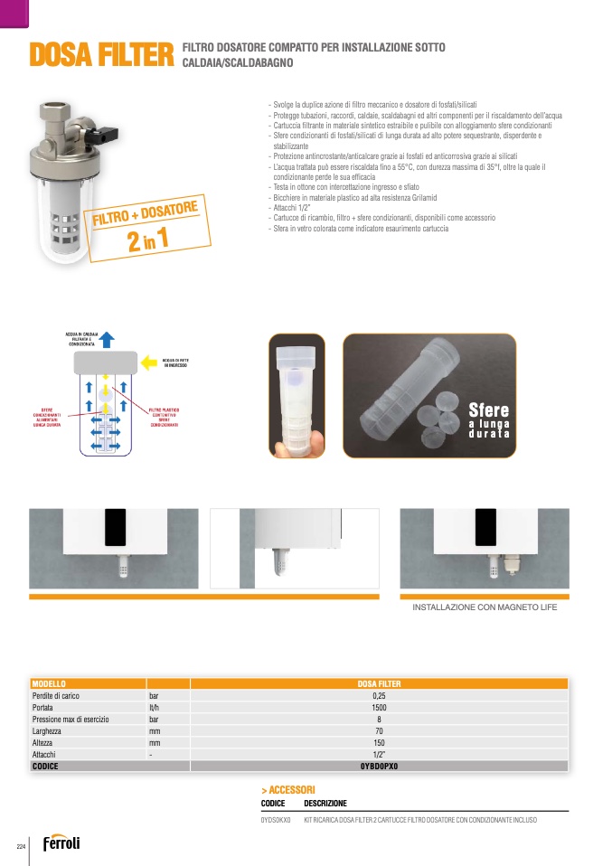 - Svolge la duplice azione di filtro meccanico e dosatore di fosfati/silicati