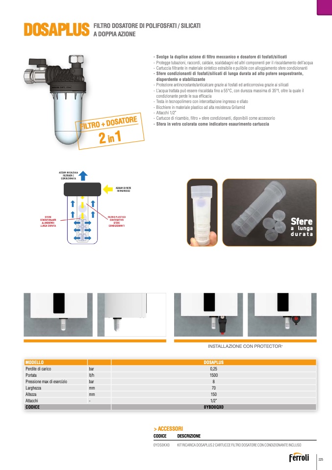 - Svolge la duplice azione di filtro meccanico e dosatore di fosfati/silicati