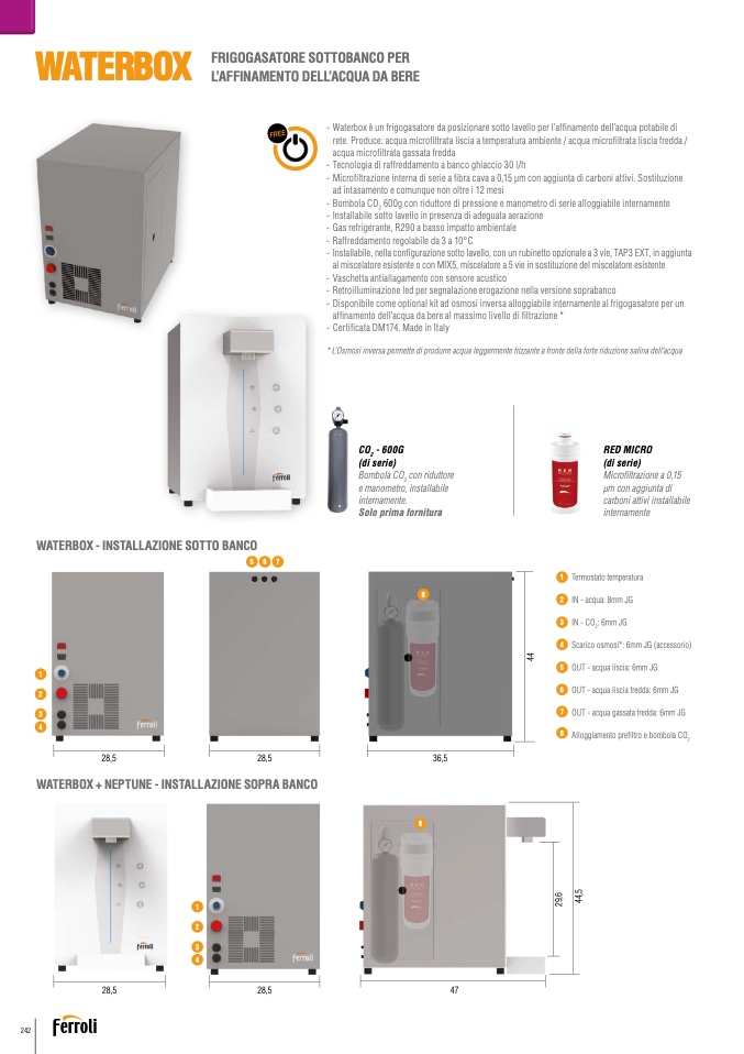 - Disponibile come optional kit ad osmosi inversa alloggiabile internamente al frigogasatore per un