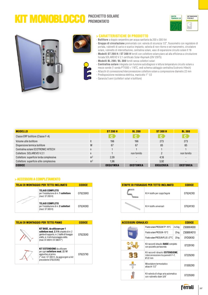 - Modelli ST 200 H / ST 300 H forniti con collettore solare piano ad alta efficienza a circolazione