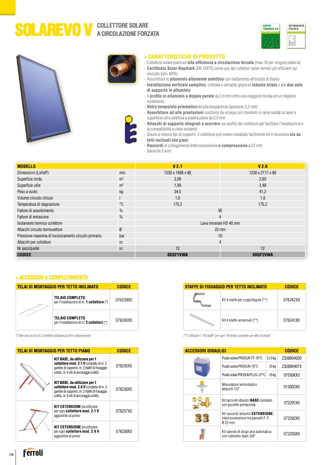 - Collettore solare piano ad alta efficienza a circolazione forzata (max 10 per singola batteria)