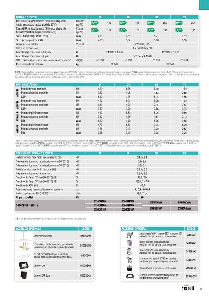 NOTA: Classe di efficienza calcolata secondo regolamento europeo 811/2013. I valori si riferiscono ad unità prive di eventuali opzioni o accessori. * SWL = Livelli di potenza sonora, riferiti a 1x10