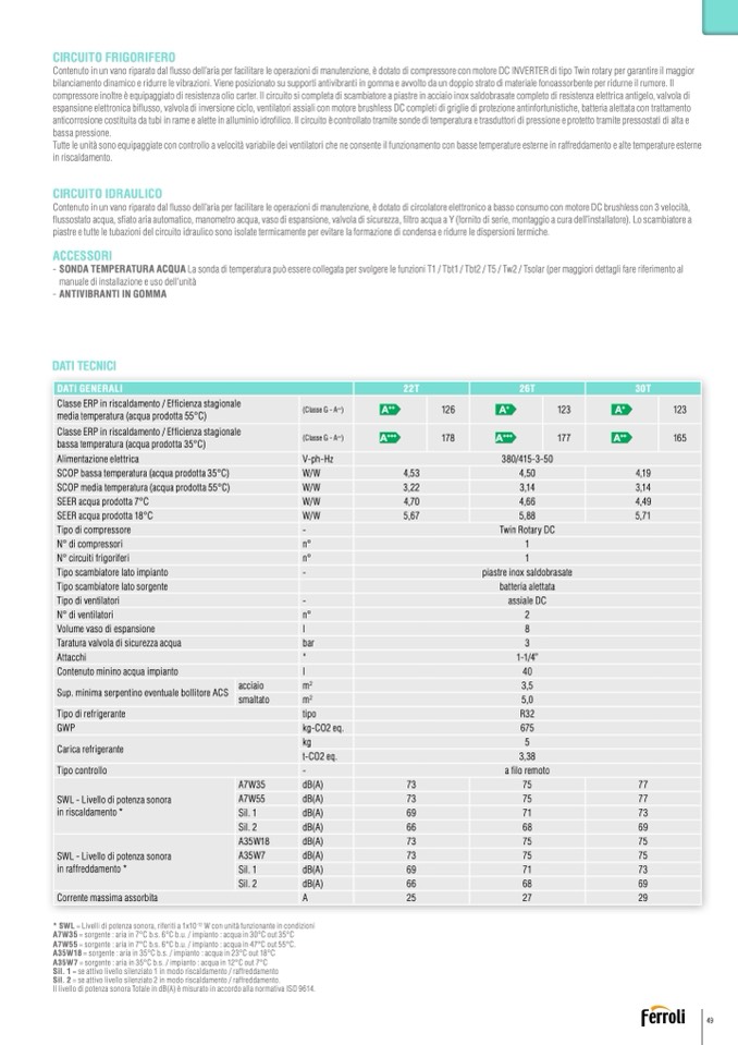 A7W35 = sorgente : aria in 7°C b.s. 6°C b.u. / impianto : acqua in 30°C out 35°C