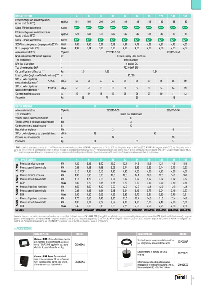 I valori si riferiscono ad unità prive di eventuali opzioni o accessori. Dati dichiarati secondo EN 14511: EER (Energy Efficiency Ratio) = rapporto potenza frigorifera su potenza assorbita COP (Coef