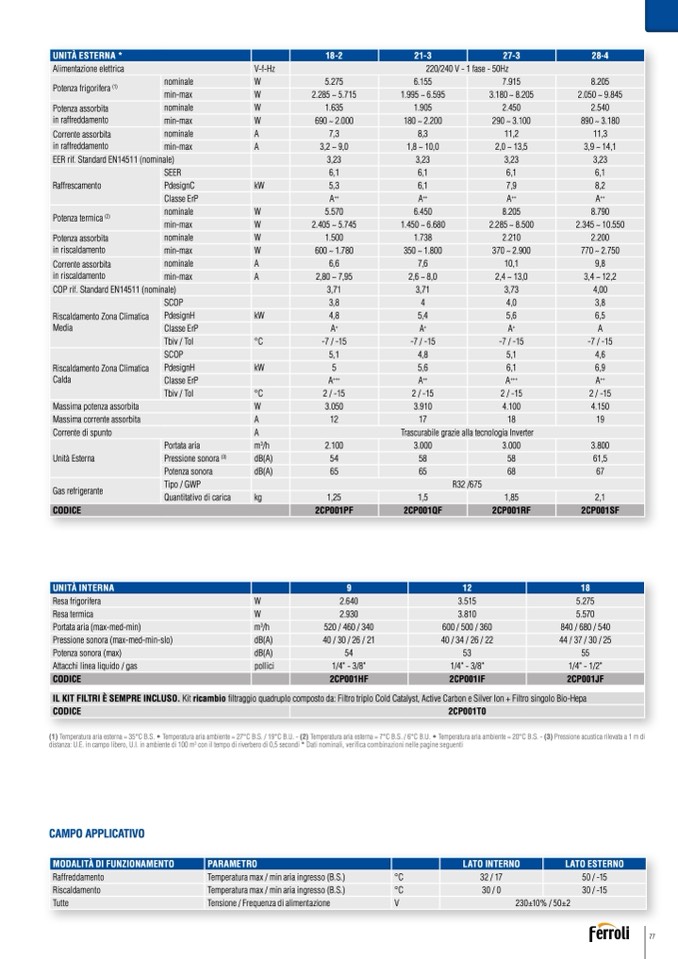 (1) Temperatura aria esterna = 35°C B.S. • Temperatura aria ambiente = 27°C B.S. / 19°C B.U. - (2) Temperatura aria esterna = 7°C B.S. / 6°C B.U. • Temperatura aria ambiente = 20°C B.S. - (3) Pressione acustica rilevata a 1 m di