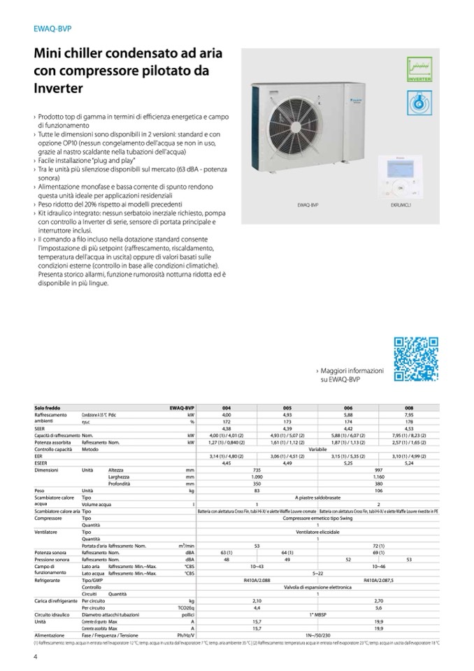 (1) Raffrescamento: temp. acqua in entrata nell'evaporatore 12 °C; temp. acqua in uscita dall'evaporatore 7 °C; temp. aria ambiente 35 °C | (2) Raffrescamento: temperatura acqua in entrata nell'evaporatore 23 °C; temp. acqua in uscita dall'evaporatore 18 °C