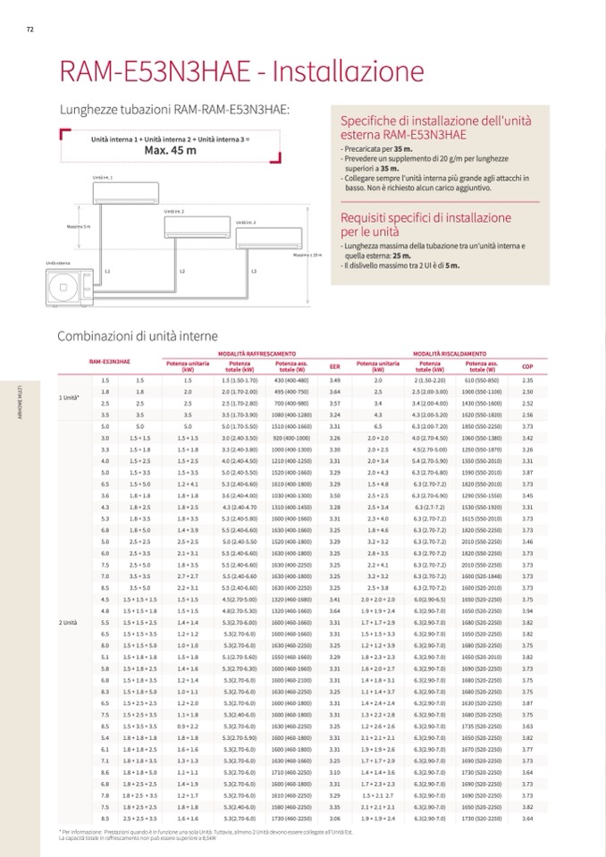 - Lunghezza massima della tubazione tra un'unità interna e