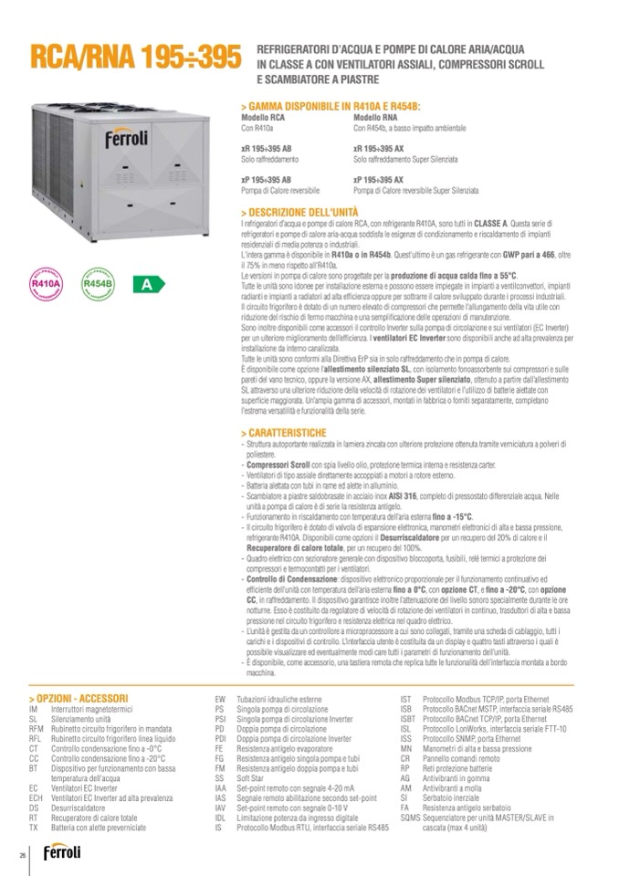 I refrigeratori d’acqua e pompe di calore RCA, con refrigerante R410A, sono tutti in CLASSE A. Questa serie di