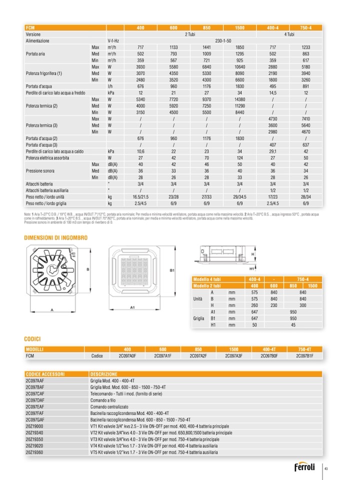 Note: 1 Aria T=27°C D.B. / 19°C W.B. , acqua IN/OUT 7°/12°C, portata aria nominale; Per media e minima velocità ventilatore, portata acqua come nella massima velocit