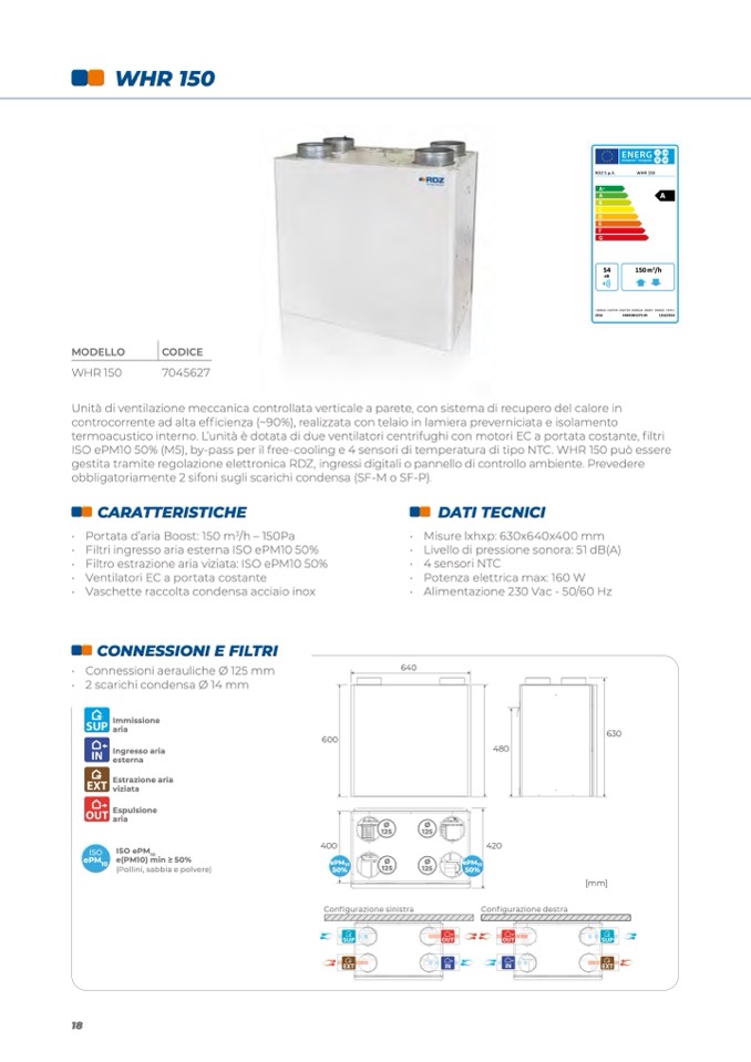 ISO ePM10 50% (M5), by-pass per il free-cooling e 4 sensori di temperatura di tipo NTC. WHR 150 può essere