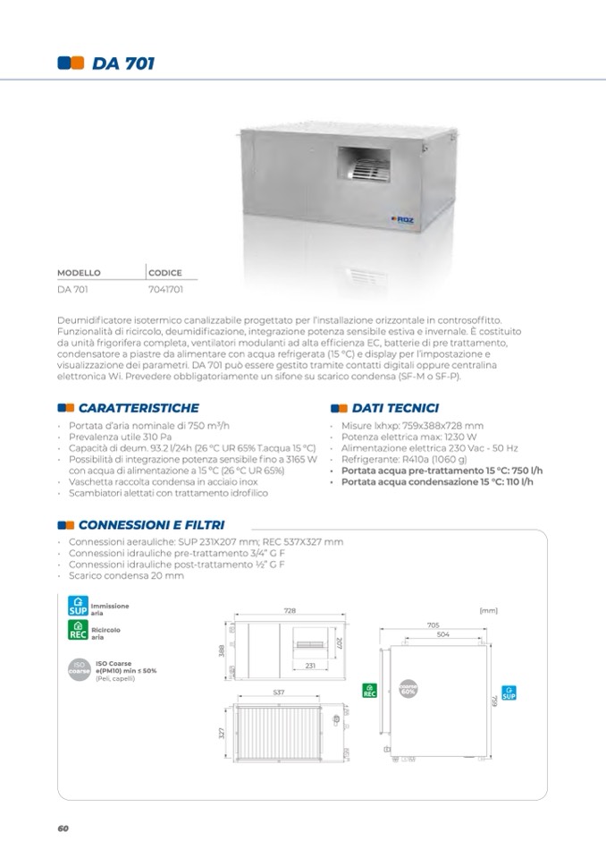 • Connessioni aerauliche: SUP 231X207 mm; REC 537X327 mm