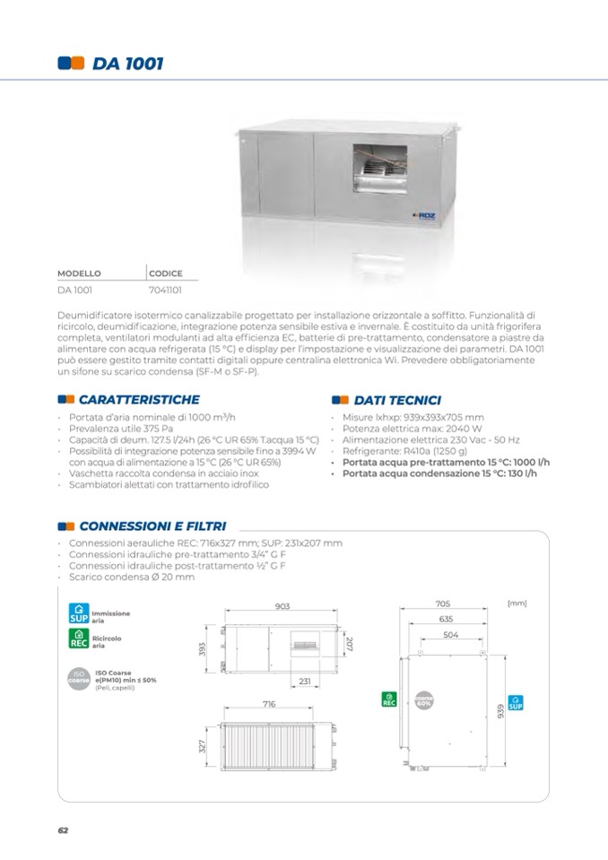 • Connessioni aerauliche REC: 716x327 mm; SUP: 231x207 mm