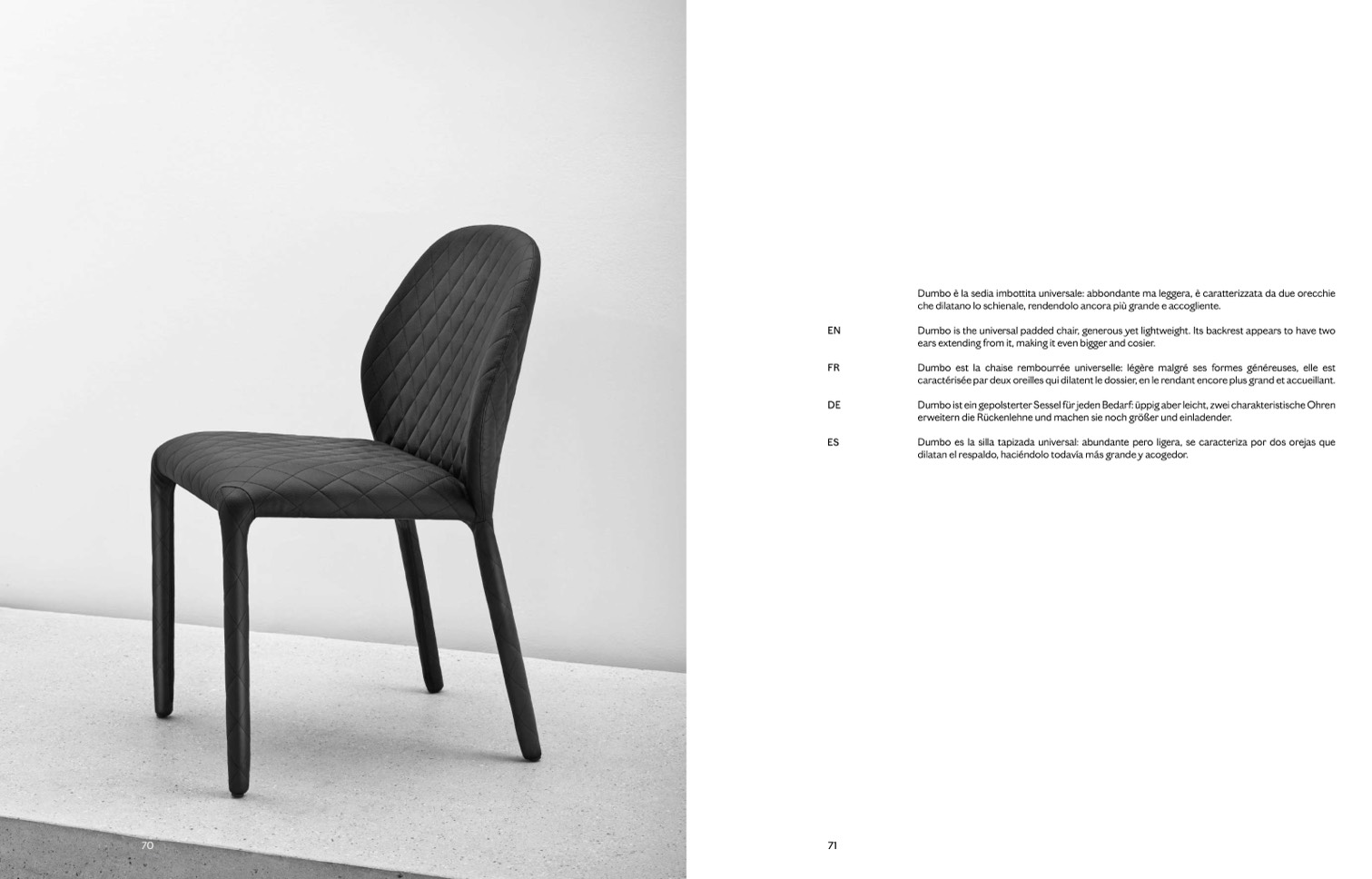 Dumbo is the universal padded chair, generous yet lightweight. Its backrest appears to have two