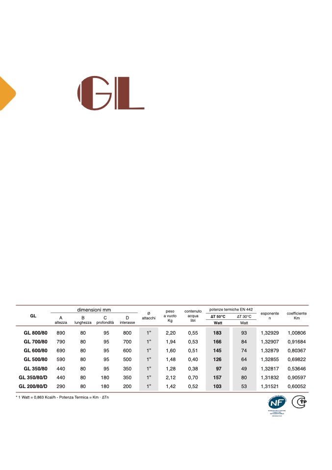 * 1 Watt = 0,863 Kcal/h - Potenza Termica = Km · ∆Tn