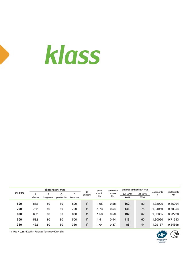 * 1 Watt = 0,863 Kcal/h - Potenza Termica = Km · ∆Tn