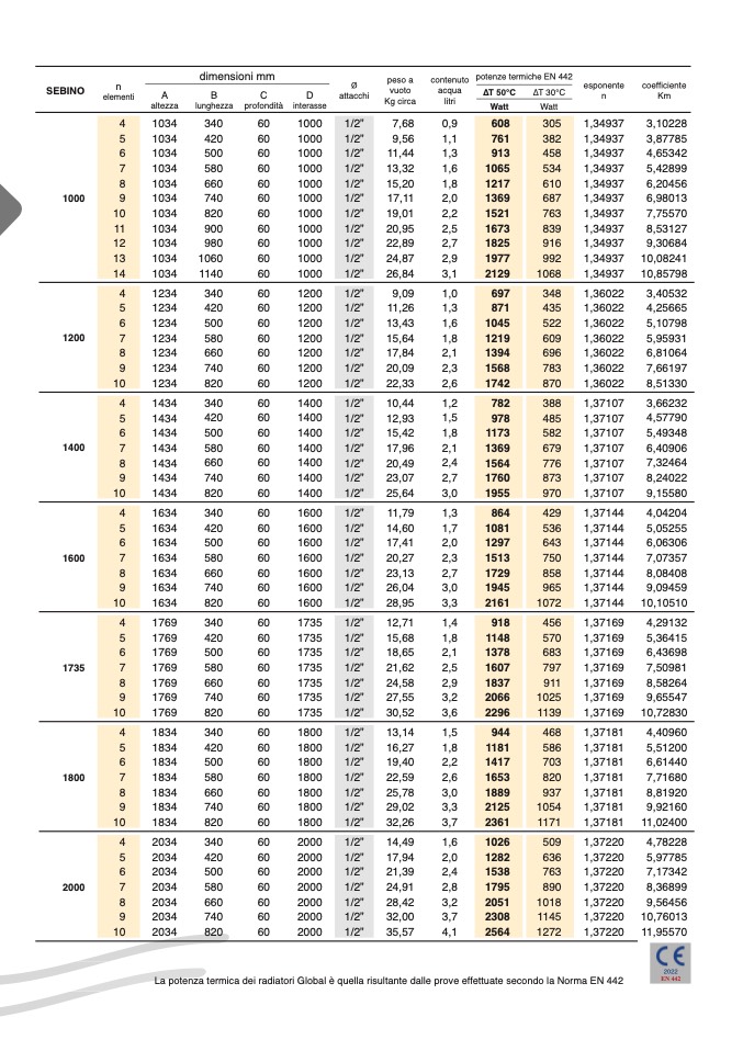 La potenza termica dei radiatori Global è quella risultante dalle prove effettuate secondo la Norma EN 442