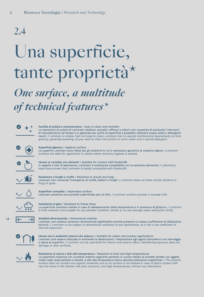 La superficie ceramica resiste in caso di abbassamento della temperatura e in presenza di ghiaccio. / Laminam
