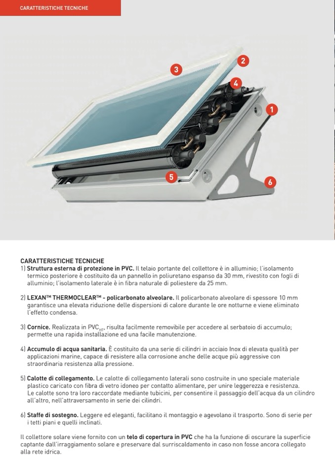 1) Struttura esterna di protezione in PVC. Il telaio portante del collettore è in alluminio; l’isolamento