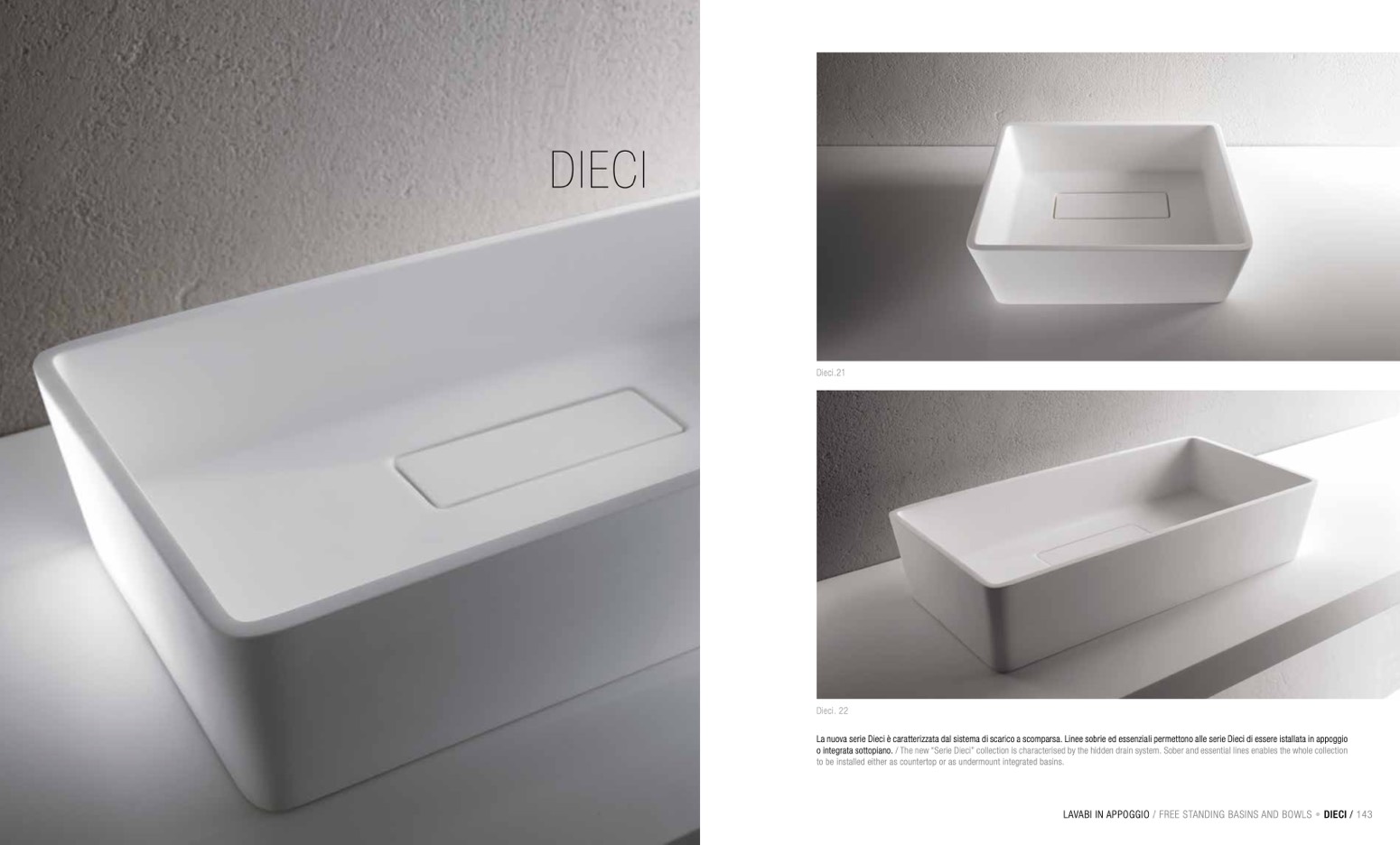 La nuova serie Dieci è caratterizzata dal sistema di scarico a scomparsa. Linee sobrie ed essenziali permettono alle serie Dieci di essere istallata in appoggio