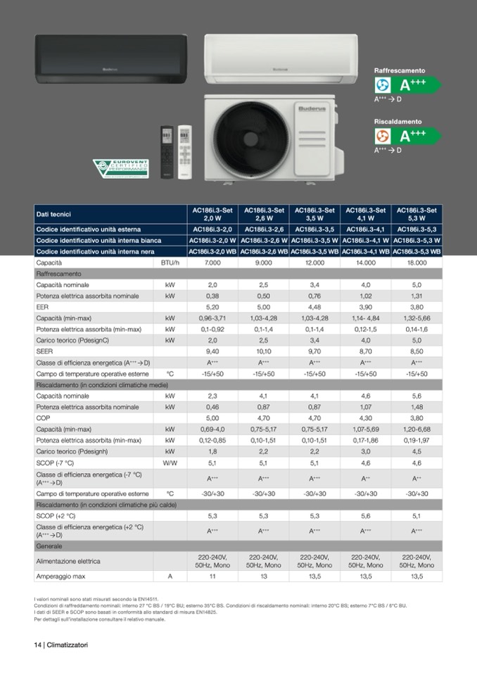 Condizioni di raffreddamento nominali: interno 27 °C BS / 19°C BU; esterno 35°C BS. Condizioni di riscaldamento nominali: interno 20°C BS; esterno 7°C BS / 6°C BU.