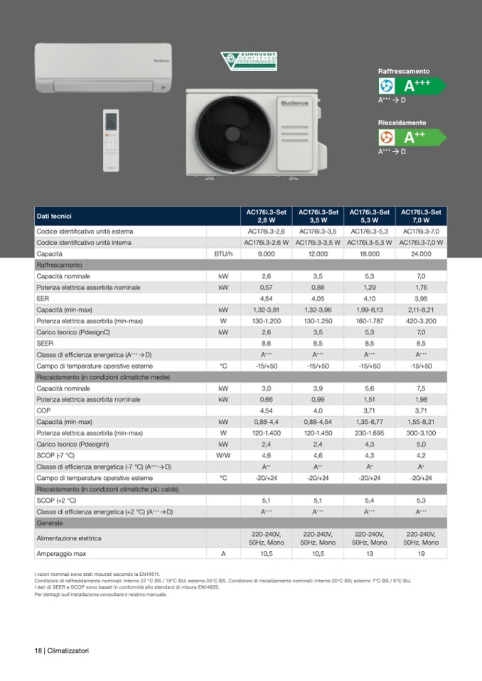 Condizioni di raffreddamento nominali: interno 27 °C BS / 19°C BU; esterno 35°C BS. Condizioni di riscaldamento nominali: interno 20°C BS; esterno 7°C BS / 6°C BU.