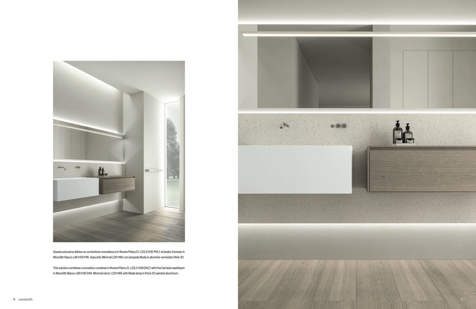 in Monolith Bianco L80 H30 D46. Minimal mirror L231 H66 with Blade lamp in Perla 121 painted aluminium.
