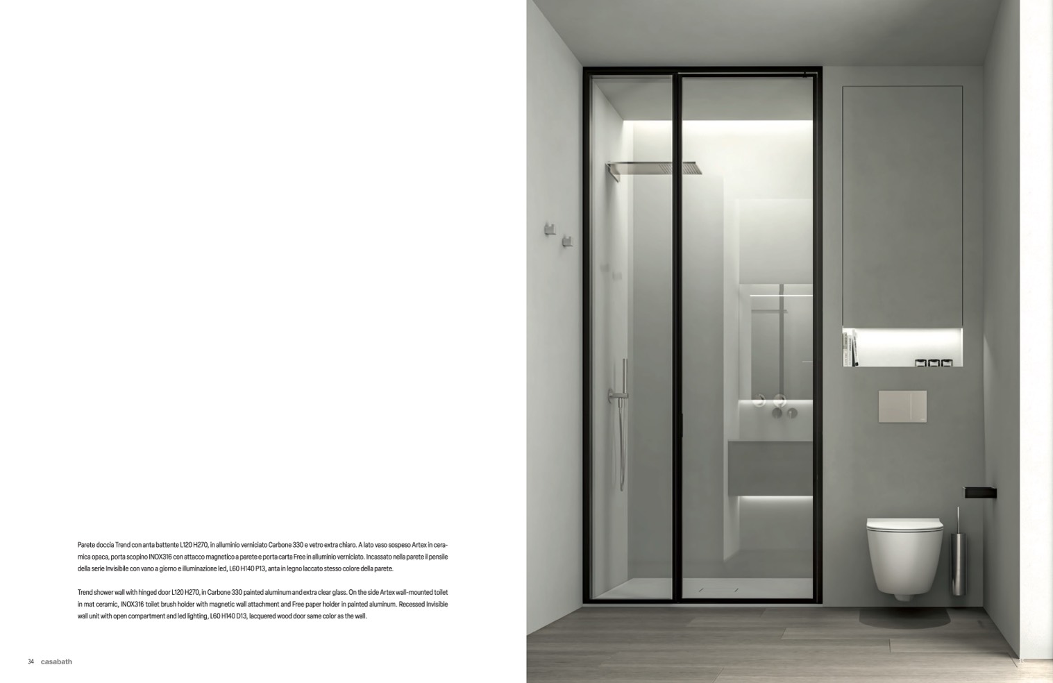 Trend shower wall with hinged door L120 H270, in Carbone 330 painted aluminum and extra clear glass. On the side Artex wall-mounted toilet