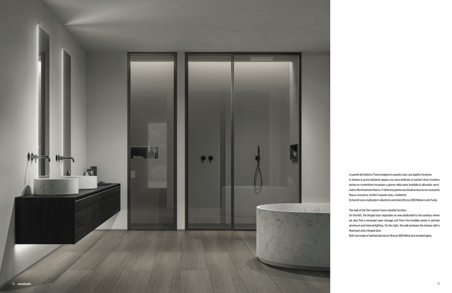 aluminum and internal lighting. On the right, the wall encloses the shower with a