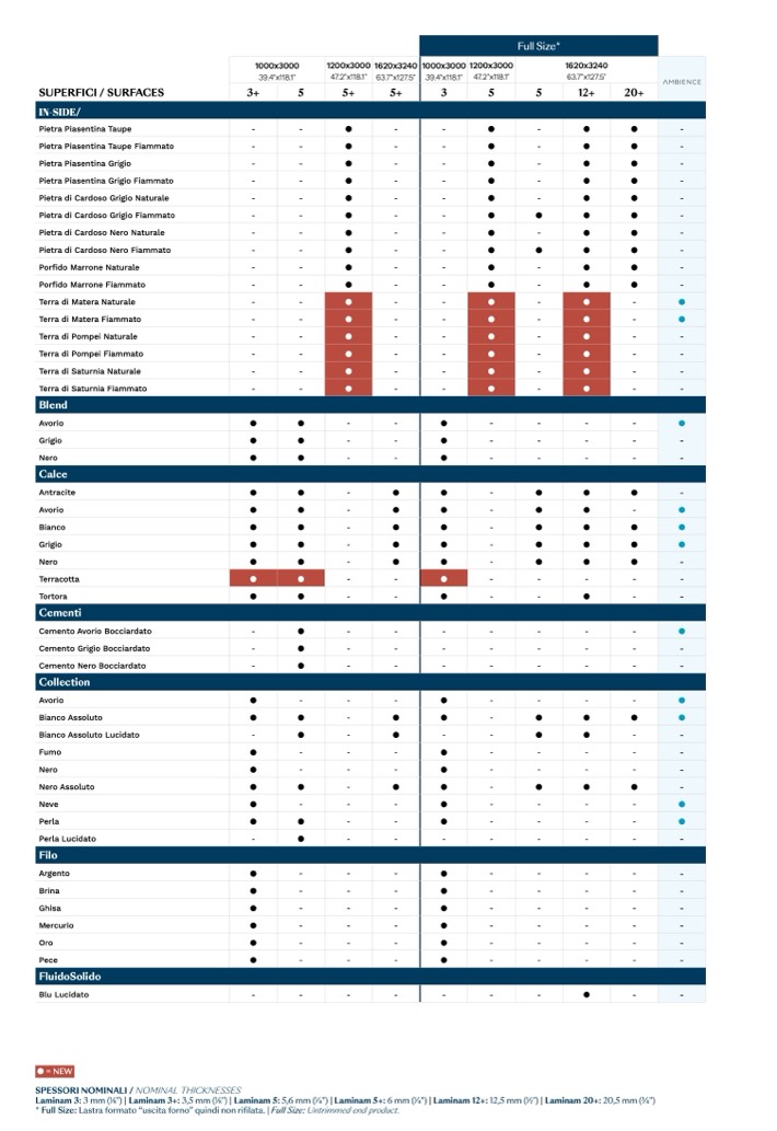 Laminam 3: 3 mm (1/8") | Laminam 3+: 3,5 mm (1/8") | Laminam 5: 5,6 mm (1/4") | Laminam 5+: 6 mm (1/4") | Laminam 12+: 12,5 mm (1/2") | Laminam 20+: 20,5 mm (3/4")