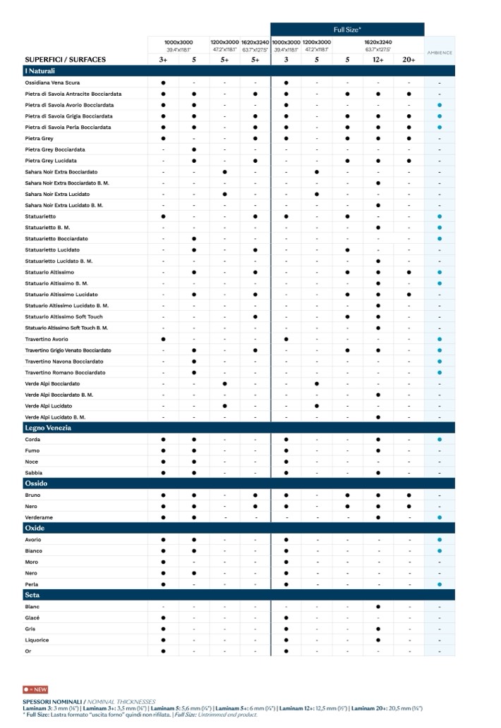 Laminam 3: 3 mm (1/8") | Laminam 3+: 3,5 mm (1/8") | Laminam 5: 5,6 mm (1/4") | Laminam 5+: 6 mm (1/4") | Laminam 12+: 12,5 mm (1/2") | Laminam 20+: 20,5 mm (3/4")