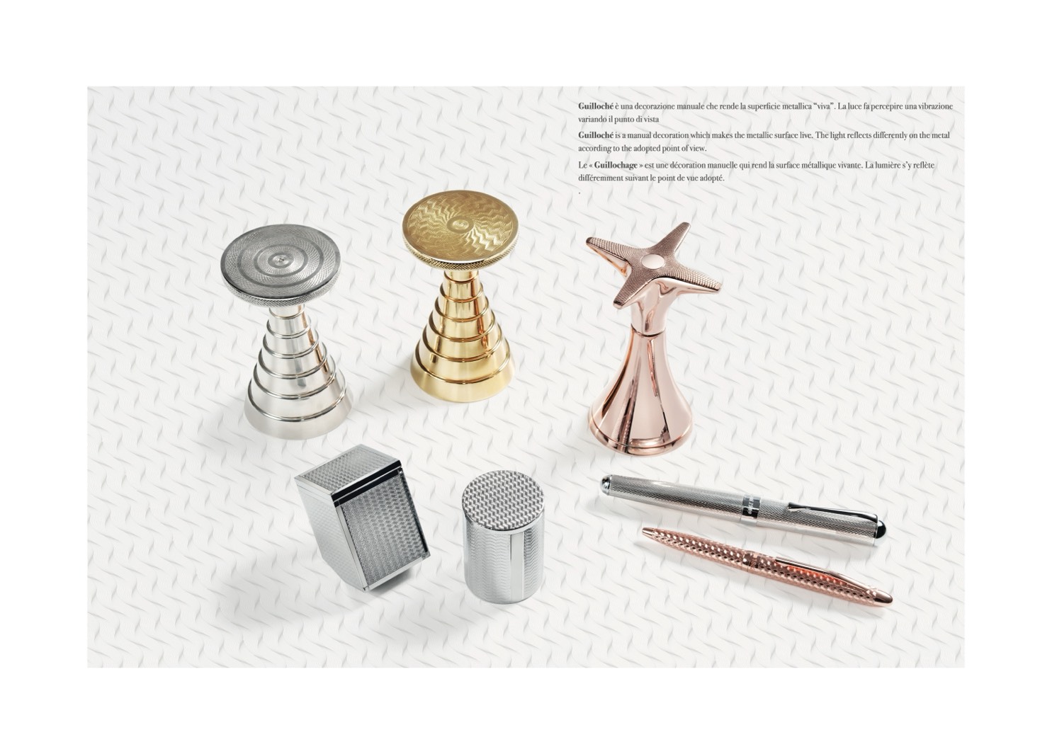 Guilloché is a manual decoration which makes the metallic surface live. The light reflects differently on the metal