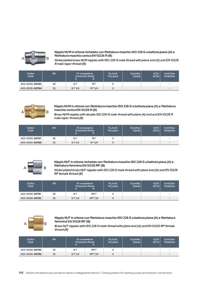 Brass M/F nipples with ISO 228 G male thread with plane end (A) and EN 10226 RP female