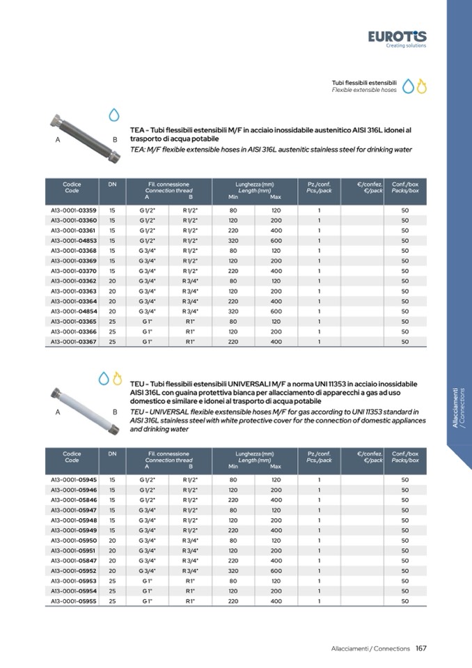 TEA: M/F flexible extensible hoses in AISI 316L austenitic stainless steel for drinking water