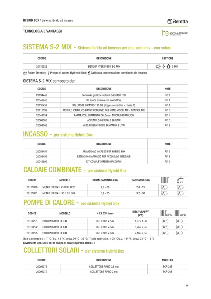 Solare Termico; Pompa di calore Hydronic Unit; Caldaia a condensazione combinata da incasso