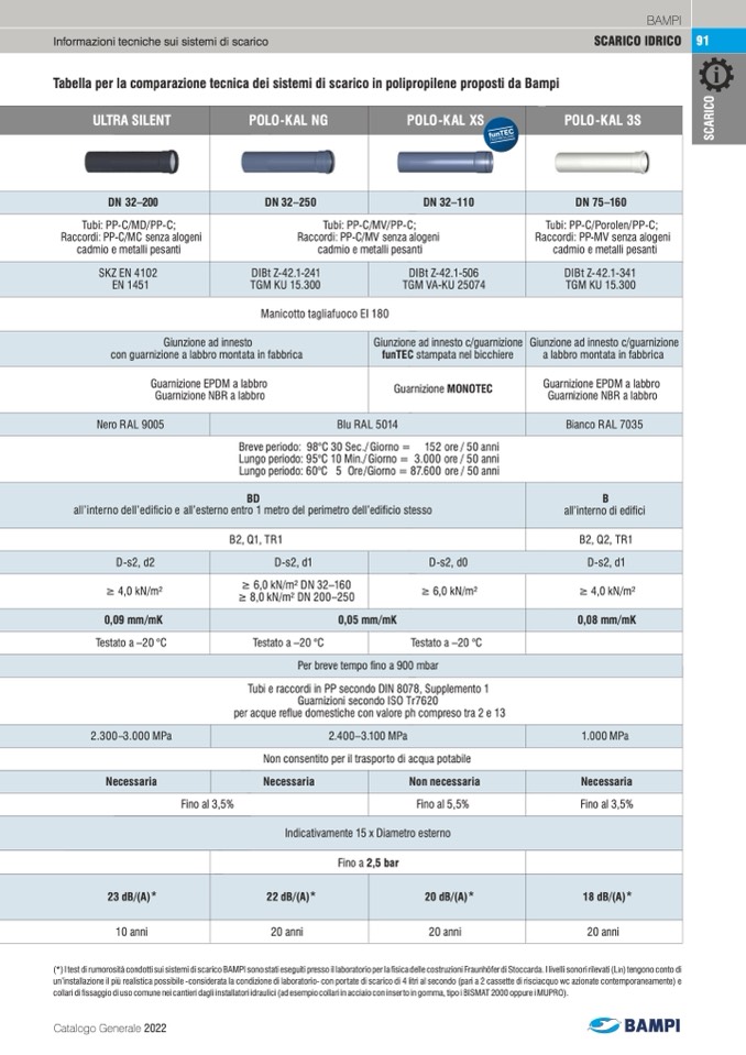 Tabella per la comparazione tecnica dei sistemi di scarico in polipropilene proposti da Bampi