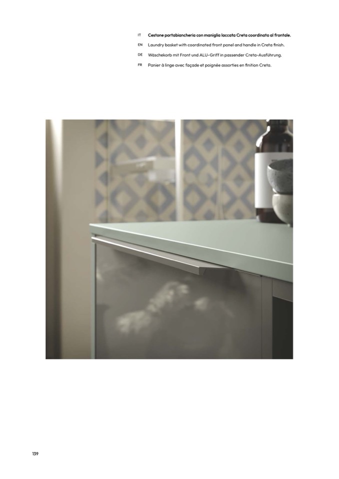 Cestone portabiancheria con maniglia laccata Creta coordinata al frontale.