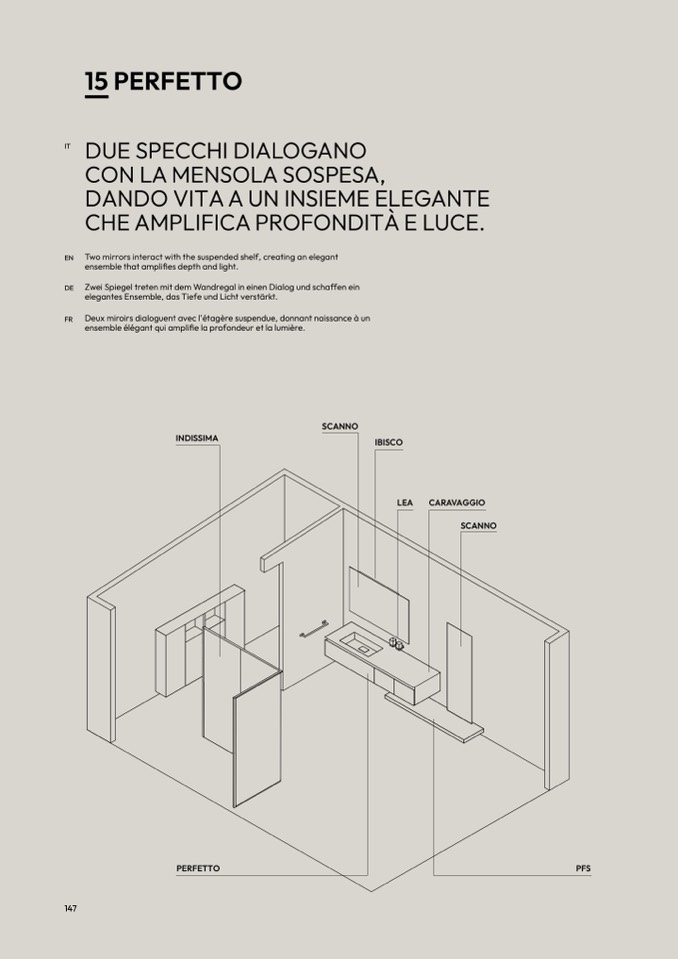 Deux miroirs dialoguent avec l’étagère suspendue, donnant naissance à un