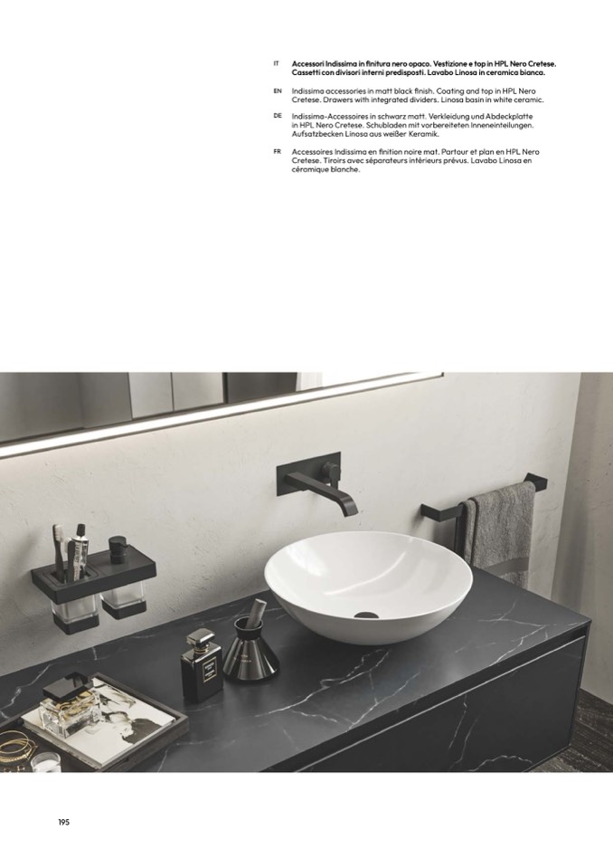 Accessori Indissima in finitura nero opaco. Vestizione e top in HPL Nero Cretese.