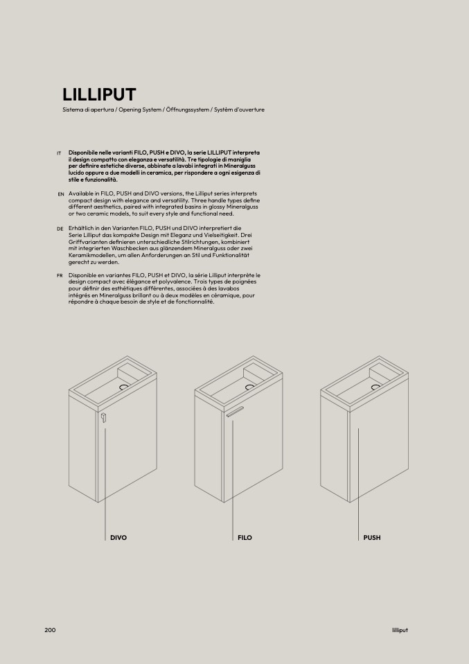EN Available in FILO, PUSH and DIVO versions, the Lilliput series interprets
