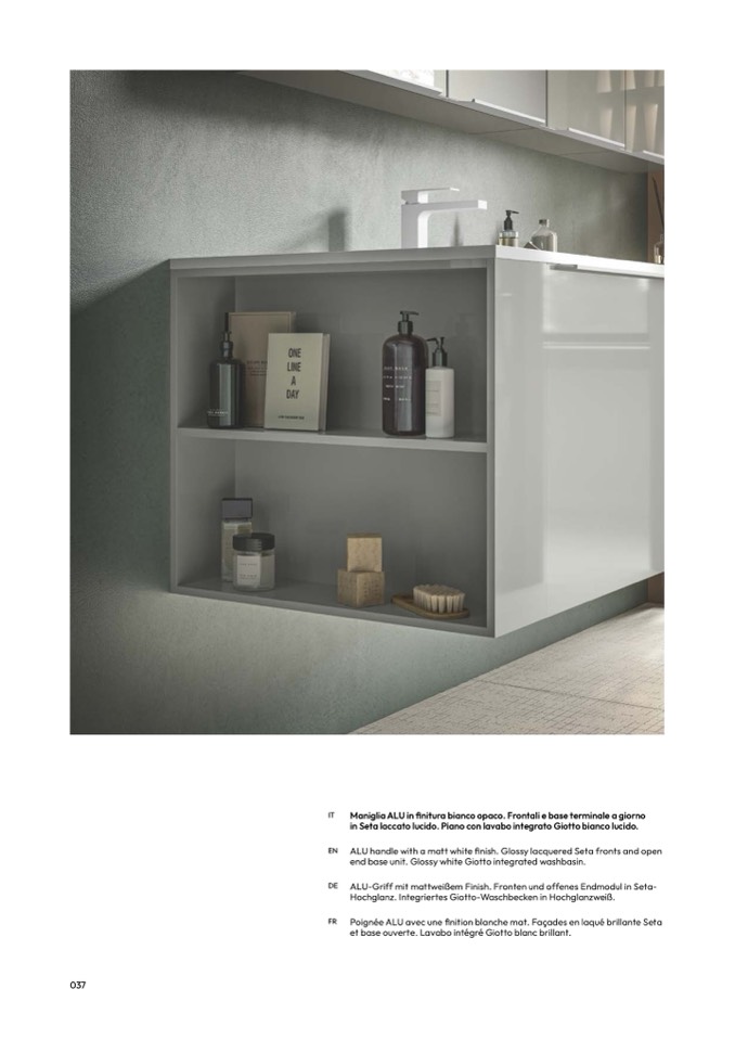 in Seta laccato lucido. Piano con lavabo integrato Giotto bianco lucido.
