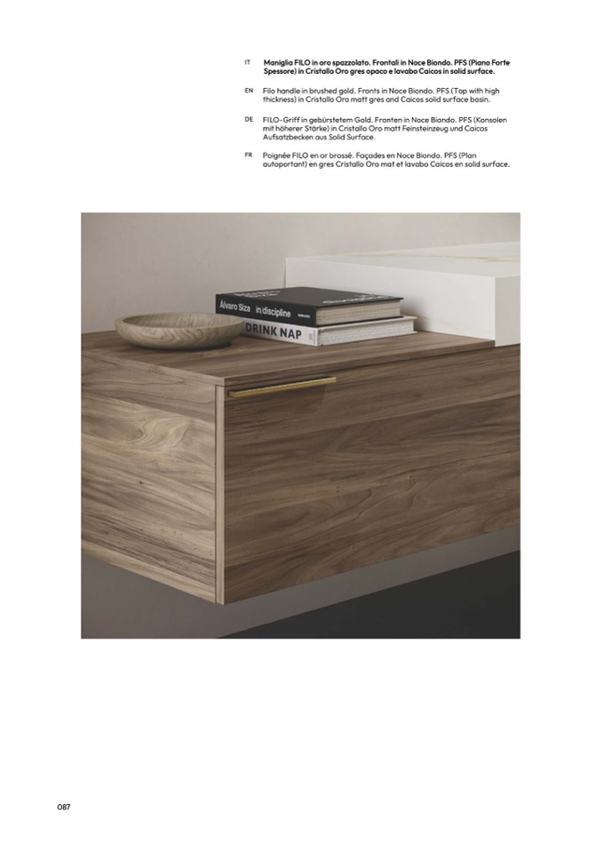 Filo handle in brushed gold. Fronts in Noce Biondo. PFS (Top with high