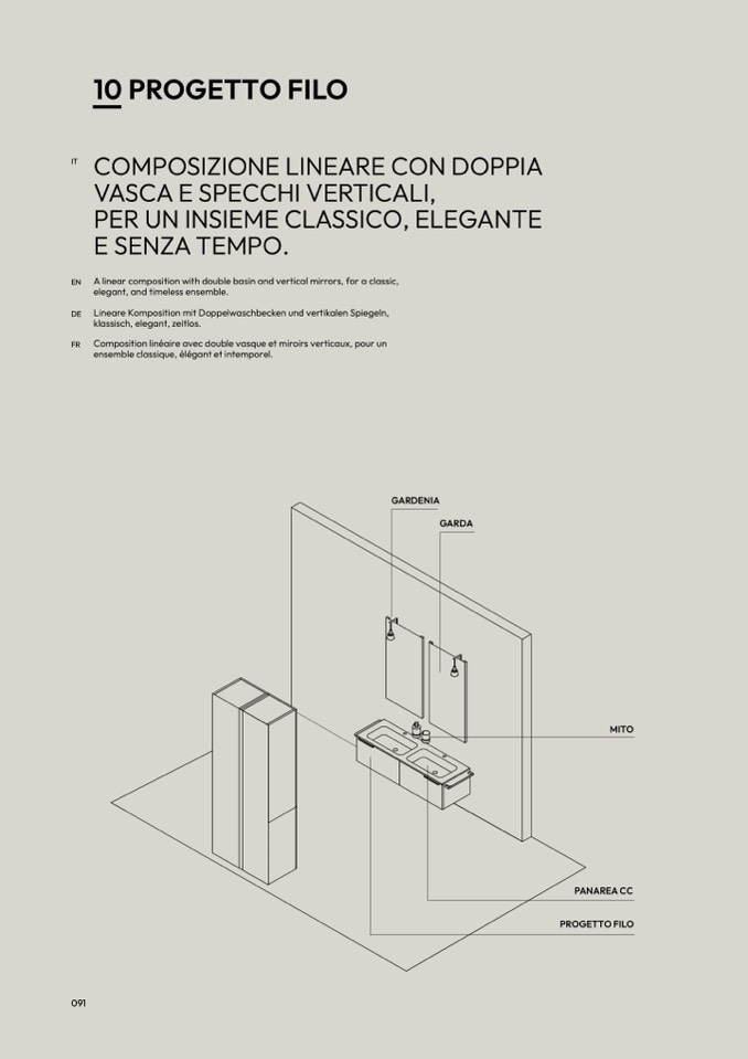 A linear composition with double basin and vertical mirrors, for a classic,