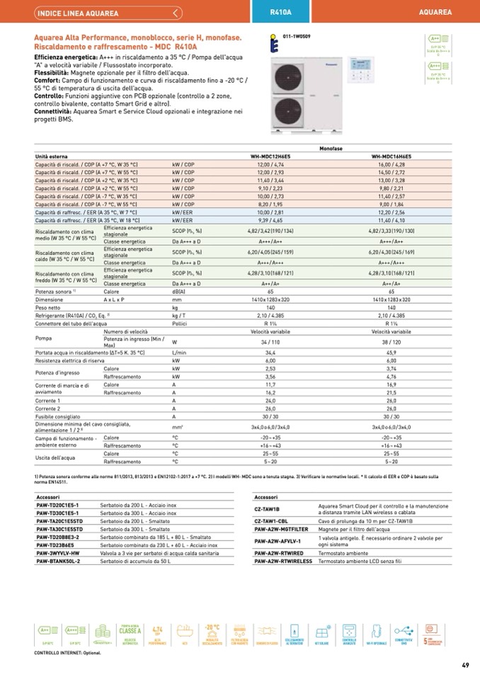 1) Potenza sonora conforme alle norme 811/2013, 813/2013 e EN12102-1:2017 a +7 °C. 2) I modelli WH- MDC sono a tenuta stagna. 3) Verificare le normative locali. * Il calcolo di EER e COP