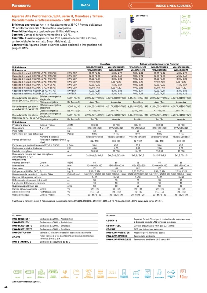 1) Verificare le normative locali. 2) Potenza sonora conforme alle norme 811/2013, 813/2013 e EN12102-1:2017 a +7 °C. * Il calcolo di EER e COP è basato sulla norma EN14511.
