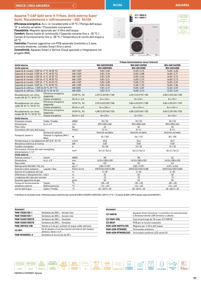 1) Verificare le normative locali. 2) Potenza sonora conforme alle norme 811/2013, 813/2013 e EN12102-1:2017 a +7 °C. * Il calcolo di EER e COP è basato sulla norma EN14511.