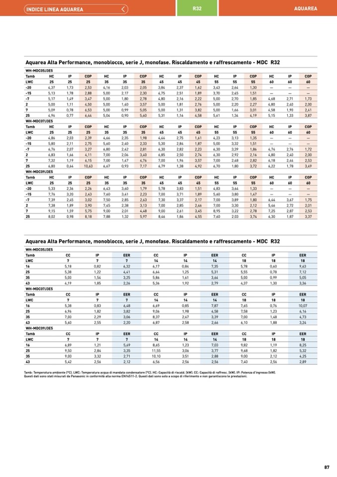 Tamb: Temperatura ambiente (°C). LWC: Temperatura acqua di mandata condensatore (°C). HC: Capacità di riscald. (kW). CC: Capacità di raffresc. (kW). IP: Potenza d'ingresso (kW).